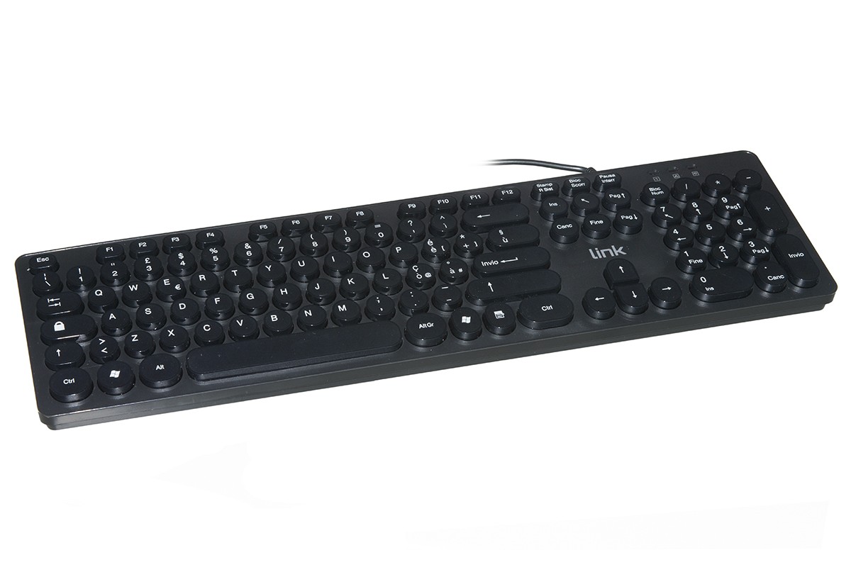 TASTIERA CON SCHEMA TASTI ITALIANO, CAVO CON CONNETTORE USB. I TASTI TONDI, OLTRE A DARE UN ASPETTO MOLTO CARATTERISTICO ALLA TASTIERA, STILE MACCHINA DA SCRIVERE, NE PERMETTONO ANCHE UNA PULIZIA PIÙ AGEVOLE TRA I TASTI.INFATTI NEGLI INTERSTIZI SOTTO E DI FIANCO AI NORMALI TASTI SI PUÒ ANNIDARE POLVERE E SPORCIZIA, MENTRE I TASTI DI QUESTA TASTIERA SONO FACILMENTE LAVABILI IN QUANTO NON HANNO SPAZI NASCOSTI SOTTOSTANTI.CON SOTTOTASTI CHE PERMETTONO UNA DIGITAZIONE MORBIDA E CONFORTEVOLE.PIEDINI DI APPOGGIO PIEGHEVOLI E RIALZABILI PER DARE UNINCLINAZIONE CORRETTA ALLA TASTIERA.DESIGN ELEGANTE, TASTI SILENZIOSI, PROFILO BASSO, TASTIERA NUMERICA DI DIMENSIONI STANDARD.Ê SUFFICIENTE COLLEGARE LA TASTIERA TRAMITE LA PORTA USB A UN PERSONAL COMPUTER DESKTOP O A UN NOTEBOOK ED È GIÀ PRONTA PER L'UTILIZZO.COLORE NERO OPACIZZATO.CON 3 LED PER BLOC NUM, BLOC SCORR, MAIUSCOLO.TASTIERA ITALIANA USB CON TASTI TONDI COLORE NEROtastiere, vendita online, ElettroJoyce.com, accessori PC, periferiche informatiche, offerte tastiere